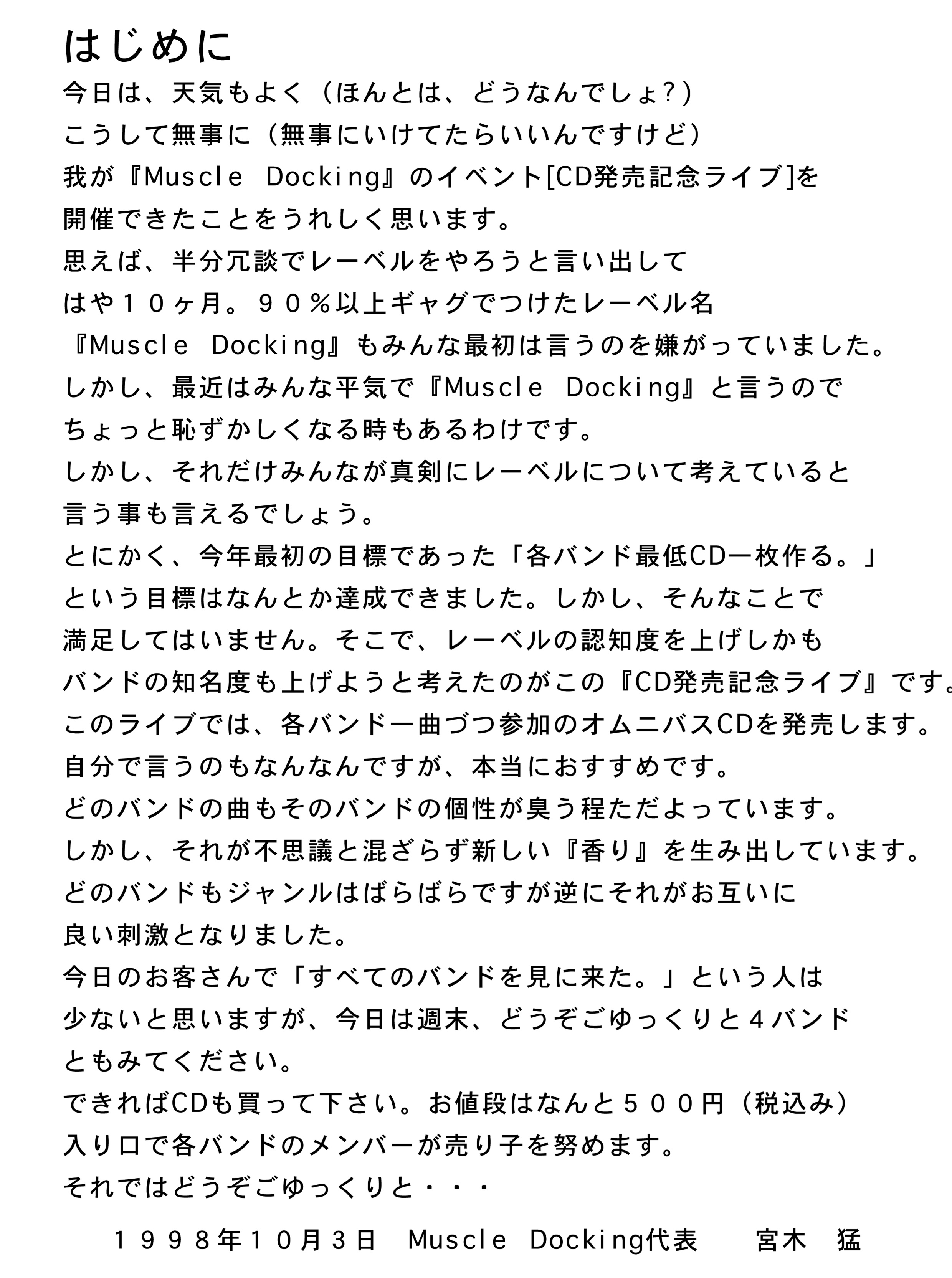 1998年10月3日にレーベル初めてのイベント「Muscle Docking祭り」を開催した。